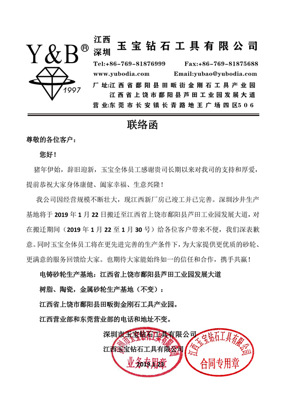 承蒙您長(zhǎng)期以來大力支持與配合,在此,玉寶全體員工謹(jǐn)表示由衷的謝意!因我司業(yè)務(wù)發(fā)展需要和公司規(guī)模的擴(kuò)大,自2019年1月22日起,深圳工廠將搬遷至新的地區(qū),具體聯(lián)系方式附后。給您帶來的不便,我們深表歉意!我司將以此次搬遷為一個(gè)新的起點(diǎn),竭誠(chéng)為各位尊敬的客戶提供更加滿意的服務(wù)與合作,并再次感謝您長(zhǎng)期以來給與的支持與關(guān)注!
